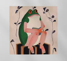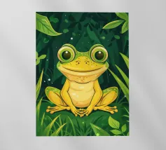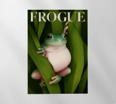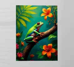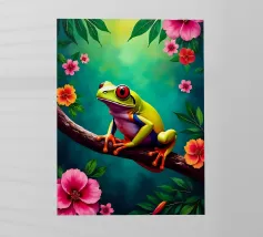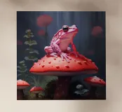 Una scena vivace e stravagante con una rana rosa brillante seduta in cima a un rospo rosso con macchie bianche, circondata da un fogliame rigoglioso e da fiori luminosi in una foresta nebbiosa e incantata. L'atmosfera magica ne esalta la bellezza surreale.