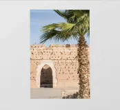 Cicogna e palma. Paesaggio botanico a Marrakech. Fotografia di strada in Marocco.