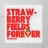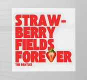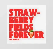 "Le parole 'Strawberry Fields Forever' sono impilate verticalmente in caratteri rossi su uno sfondo chiaro, con una fragola a fette che sostituisce lo '0' di 'Forever', creando un'atmosfera stravagante e nostalgica",