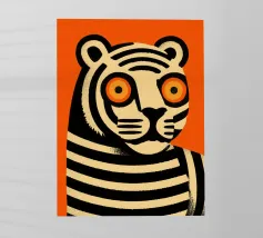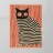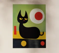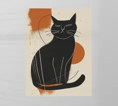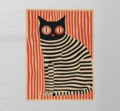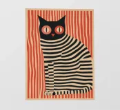 Un gatto nero è seduto maestosamente davanti a un brillante rosso carminio, il suo corpo è attraversato da fitte strisce ondulate: un motivo ipnotico che si sovrappone al pelo e allo sfondo. Lo stile riprende l'audacia grafica e la ridotta piattezza cromatica di Henri Matisse, mescolate alla vibrazione ottica di Bridget Riley e all'iconica forza pubblicitaria dello stile svizzero. I grandi occhi rosso fuoco fissano lo spettatore con calma intensità, mentre le strisce creano un leggero movimento e profondità. Si crea un'atmosfera di silenziosa dominanza e misteriosa eleganza.