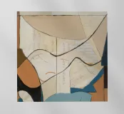 This painting features an abstract composition with flowing lines and shapes, using a muted color palette of beige, brown, and blue. The artwork is subtle and elegant, creating a sense of harmony and balance.