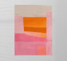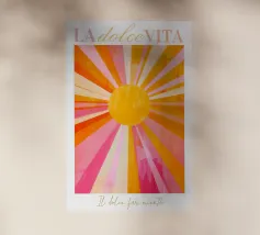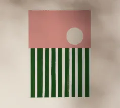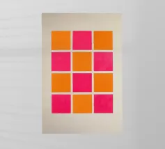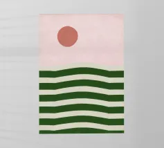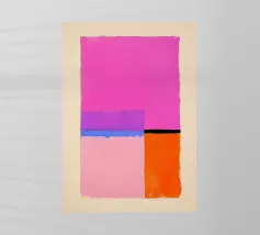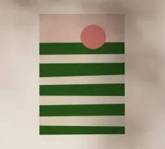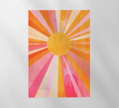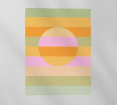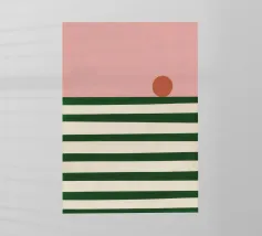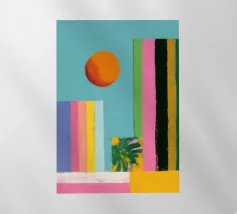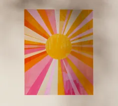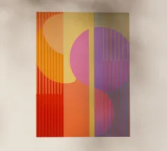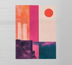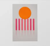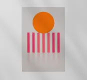 Un cerchio arancione brillante fluttua sopra sette barre verticali rosa, come un sole astratto sopra un paesaggio geometrico. Quest'opera d'arte minimalista emana una tensione quasi meditativa grazie alla sua chiarezza, alla simmetria e ai contrasti di colore. Ideale per ambienti moderni che privilegiano il colore, la forma e la tranquillità.