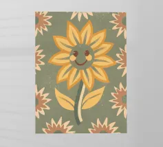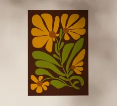 Forme astratte di colore giallo e arancione brillante che ricordano un girasole. Forme curve e piccole linee aggiungono un senso dinamico di movimento alla composizione.