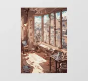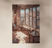 finestre luce solare interno paesaggio urbano computer portatile piante d'appartamento tazze di caffè sgabelli in legno libri tavolo in legno teiera tazze edifici sedie carte assi del pavimento lampade da parete nuvole paesaggio urbano vista urbana