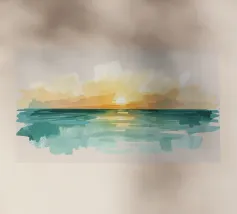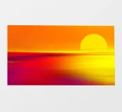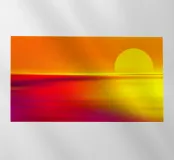 Tramonto, astratto. Fantasia con sole, spiaggia e mare,