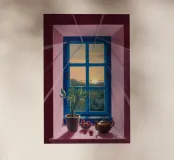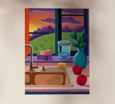 Una scena tranquilla di due tazze di tè su un davanzale, con la vista di un bellissimo tramonto attraverso la finestra. La composizione è pacifica e romantica e cattura un momento perfetto e tranquillo.
