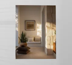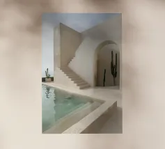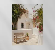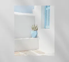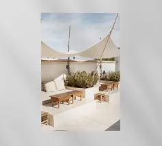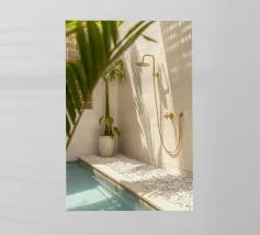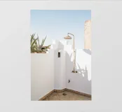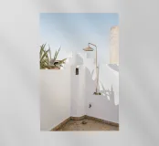 Escape to a bohemian paradise with this stunning photograph of a white outdoor shower on a sunlit rooftop in Marrakech. The minimalist design, with its clean lines and natural textures, perfectly blends with the warm Moroccan sun, creating a tranquil oasis high above the city. Surrounded by white walls and terracotta tiles and a gentle breeze, this serene space evokes a sense of freedom and relaxation. Ideal for infusing your home with the laid-back elegance of Moroccan style, this image captures the beauty of outdoor living and the spirit of Marrakech’s timeless charm.