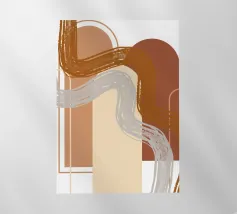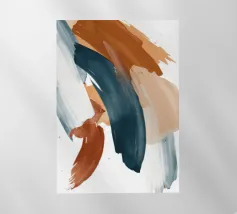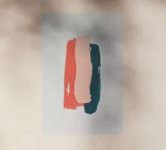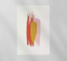 Tratti di pennello e pittura laminata in strati di toni caldi: tan, pesca, arancio, macchie di inchiostro nero e rosso.