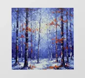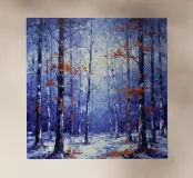 Questa straordinaria opera, "Crimson Whispers in a Winter Wood", è un dipinto a olio fortemente strutturato creato con una spatola, che cattura la tranquilla bellezza di una foresta invernale. L'opera è dominata da una tavolozza fredda ed eterea di blu profondi, lavanda e bianco, che raffigura il terreno coperto di neve e i tronchi spogli ed eleganti di betulle e querce. Questi toni freddi sono drammaticamente contrastati da vibranti schiocchi di foglie calde, arancioni e cremisi, aggrappate ai rami. I tratti spessi e tattili creano una qualità tridimensionale, invitando a percepire l'aria frizzante e il silenzio della foresta.