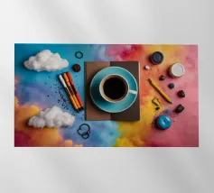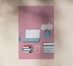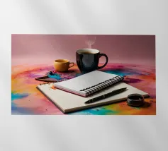 Un taccuino a righe con fiori vivaci si trova su uno sfondo blu e rosa, accompagnato da matite colorate e da una matita arancione, per creare un'area di lavoro allegra.