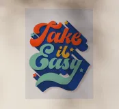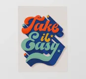 Un vivace disegno tipografico in stile retrò con la frase "Take It Easy" in grassetto, con caratteri ispirati agli anni '70. Il caldo mix di rosso, blu e verde menta con accenti di stelle aggiunge un'atmosfera giocosa e nostalgica, perfetta per un'estetica rilassata ed elegante. Un pezzo elegante e nostalgico che irradia calma e gioia. Creato da showmemars