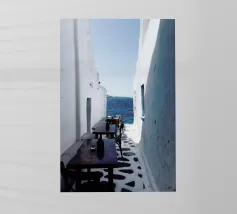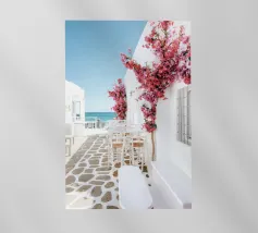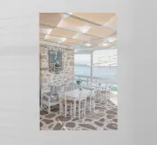 Greek white Ibiza style terrace on the island of Crete in Greece on a hot summer day