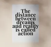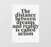 "Le parole 'La distanza tra i sogni e la realtà si chiama azione' sono disposte in un layout tipografico di grande impatto visivo, che sottolinea il potere di agire per raggiungere gli obiettivi. Il testo è audace e d'impatto, su uno sfondo pulito e minimalista, che crea un senso di motivazione e determinazione",
