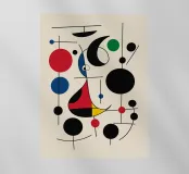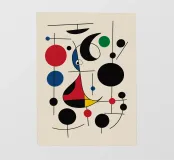 Una composizione astratta caratterizzata da forme geometriche audaci e colori primari, come il rosso, il blu, il verde e il giallo. La composizione comprende cerchi, linee e curve che creano un senso di movimento ed equilibrio.