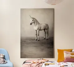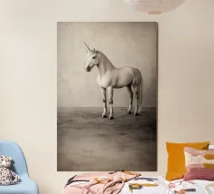 Sperimentate la pura magia di una creatura leggendaria con questo splendido ritratto di unicorno. Catturato in uno stile artistico senza tempo, il maestoso unicorno bianco si erge con grazia e potenza. Lo sfondo minimalista e strutturato esalta la sua bellezza eterea, rendendolo un pezzo sofisticato e incantevole per un interno classico o moderno, per la stanza di un bambino o per qualsiasi spazio che abbia bisogno di un po' di meraviglia. Unicorno, Creatura mitica, Fantasia, Bianco e nero, Seppia, Maestoso, Cavallo, Magia, Elegante, Minimalista, Wall Art, P