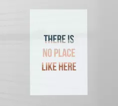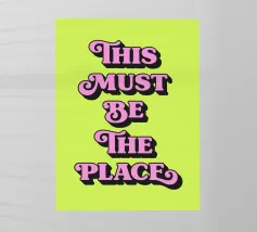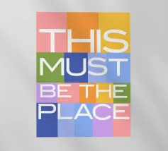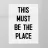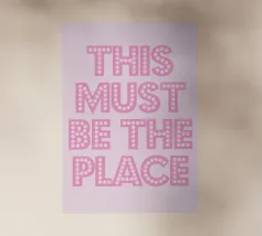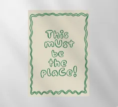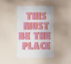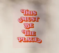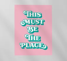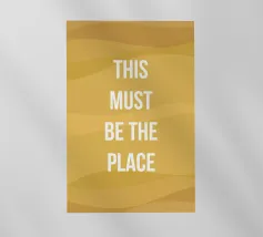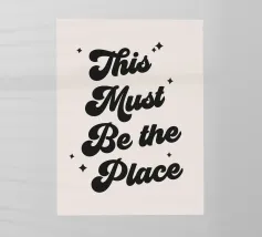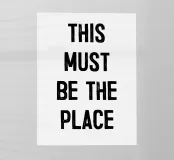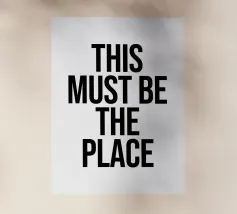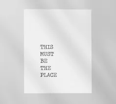 La frase "THIS MUST BE THE PLACE", in grassetto e in caratteri neri, è riportata su uno sfondo bianco. Il testo si distingue per l'effetto leggermente affilato, che gli conferisce un fascino rustico.
