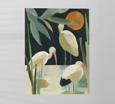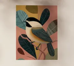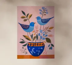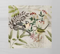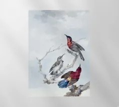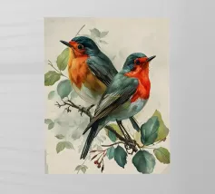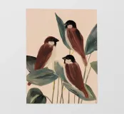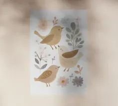 A quiet scene of three sparrows on branches with simple leaves.