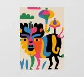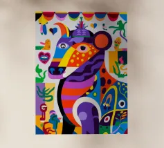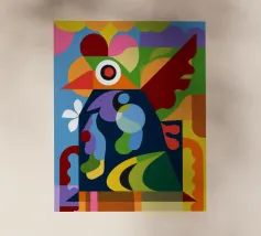 Raffigurazione astratta di un toro dal corpo colorato e geometrico. Lo sfondo comprende varie forme e motivi astratti.