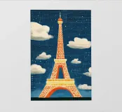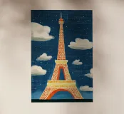L'immagine mostra la Torre Eiffel in un cielo notturno di un blu intenso, con nuvole bianche, stelle scintillanti e una mezzaluna arancione. La torre stessa risplende nei toni caldi del giallo e dell'arancione e si staglia radiosa sullo sfondo scuro. Lo stile è chiaramente illustrativo e artistico, un misto di romanticismo sognante e colorazione espressiva. Ricorda un dipinto o un poster digitale che enfatizza l'atmosfera e lo stato d'animo piuttosto che la precisione realistica. Un gioco visivamente affascinante tra fantasia e punto di riferimento.