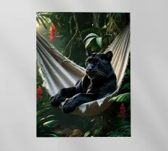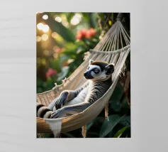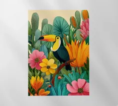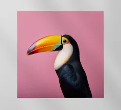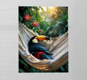 Con il suo iconico becco e la sua posa rilassata, questo tucano sembra nato per la vita sull'amaca. Porta colore e calma, sia che lo appendiate in giardino che in un angolo soleggiato. Una stampa estiva che ricorda che anche il dolce far niente è un talento. Questa stampa fa parte della serie "Jungle Hammock Tales" - relax estivo con una strizzatina d'occhio. Questa illustrazione digitale è stata creata in stile fotorealistico, con un occhio di riguardo per la luce, i dettagli e l'atmosfera. Visualizzata da Trinkets NL Design Studio utilizzando l'AI.