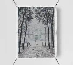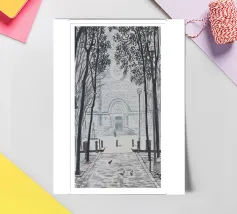 Stampa di un disegno originale di Plaça de la Virreina nel quartiere Gràcia di Barcellona. Una piacevole passeggiata, adatta alle persone e non alle auto, conduce a questa piazza da altre piazze vicine, come Plaça del Diamant e Plaça de Rovira i Trias. Avvicinandosi al Cinema Verdi, si scorge la facciata di una delle chiese più antiche di Barcellona, famosa per la sua cappella costruita da Francesc Berenguer, allievo di Antoni Gaudí.