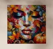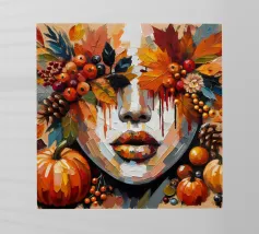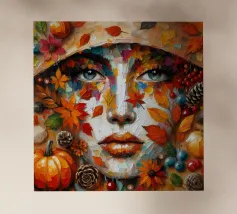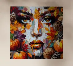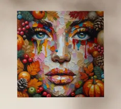 Pittura acrilica del volto di una donna durante la stagione autunnale. Foglie, zucca, ghiande e bacche.