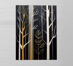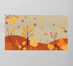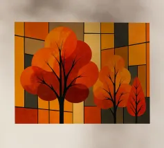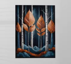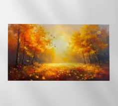 A digital painting of an autumn forest features dark tree silhouettes against a warm, golden background. The textured artwork showcases detailed foliage in shades of orange and brown, creating a serene and atmospheric woodland scene.