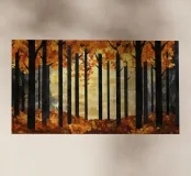 Una splendida rappresentazione astratta di una foresta autunnale con alti tronchi scuri e fogliame dorato. Lo sfondo caldo e luminoso esalta la composizione geometrica, creando un'atmosfera serena e moderna.