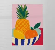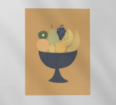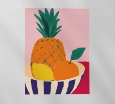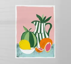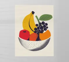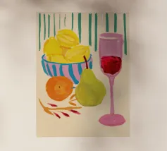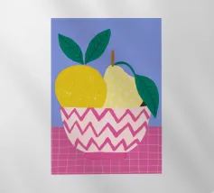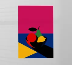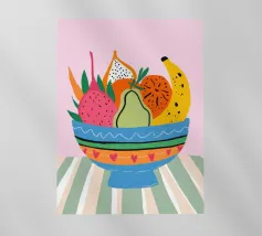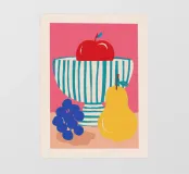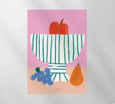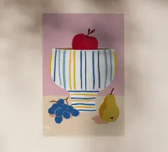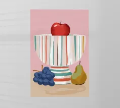 Una natura morta semplice e classica con una ciotola a righe con una mela, una pera e dell'uva, su uno sfondo rosa.