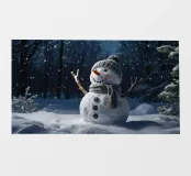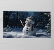 Un pupazzo di neve adornato con un cappello e una sciarpa si gode la serena bellezza di una foresta innevata al chiaro di luna, circondato da fiocchi di neve che cadono.