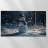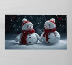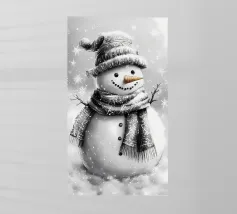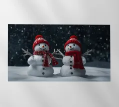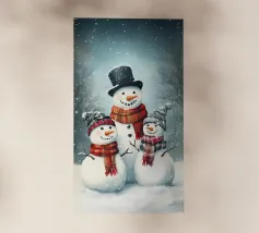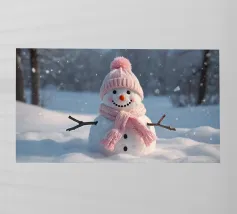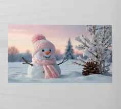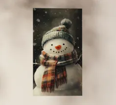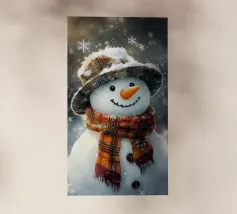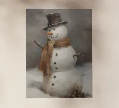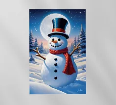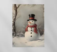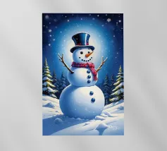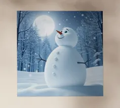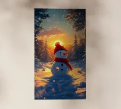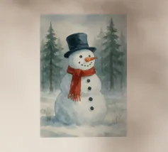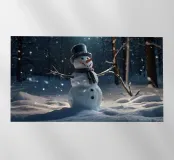 Un pupazzo di neve, con tanto di cappello a cilindro e sciarpa, saluta la sera d'inverno in una foresta serena. I fiocchi di neve cadono delicatamente intorno, creando un'atmosfera magica.