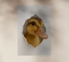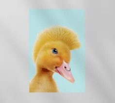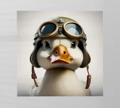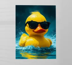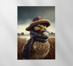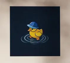 Un simpatico anatroccolo con un piccolo cappello sguazza in uno stagno tranquillo, creando lievi increspature, mentre il tenue bagliore della luna illumina l'acqua di notte.