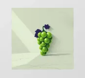 Un grappolo d'uva di un verde intenso poggia su uno sfondo chiaro, illuminato da una luce delicata che ne mette in risalto la consistenza lucida e le ombre sottili.