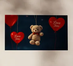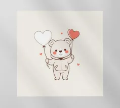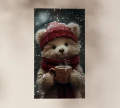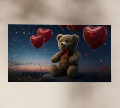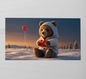 Un simpatico orsacchiotto vestito con un'accogliente felpa con cappuccio siede nella neve, tenendo gioiosamente un cuore rosso mentre un palloncino si muove nell'aria fresca della sera sotto un tramonto colorato.