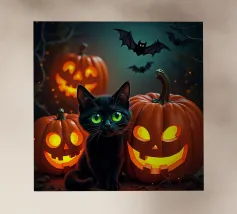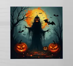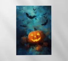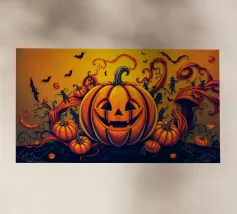 Al calare del crepuscolo, una strega in silhouette vola a cavallo della sua scopa tra i pipistrelli, con una zucca incandescente in primo piano, creando un'atmosfera incantevole.