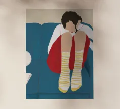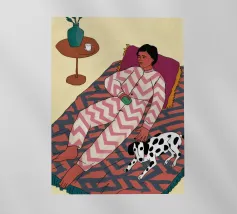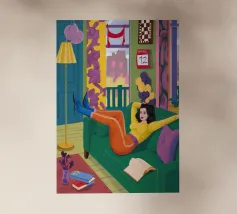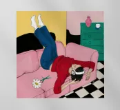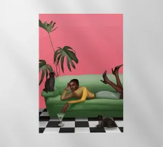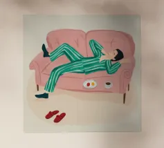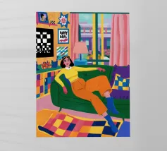 A woman lies upside down on a pink sofa, with her legs in the air, on a checkered floor. The composition is playful, quirky, and a fun, modern depiction of carefree, youthful relaxation.