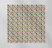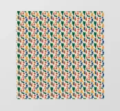 Un motivo colorato e ripetuto è composto da forme astratte nelle tonalità del verde, del giallo, del blu e del rosso. Ogni elemento forma una disposizione geometrica che crea un effetto visivo vibrante e ritmico.