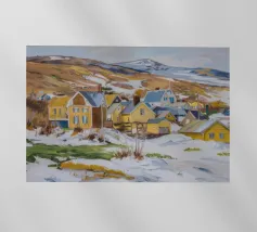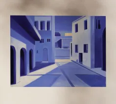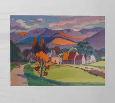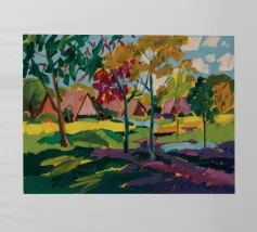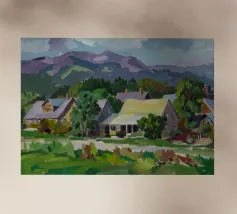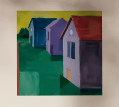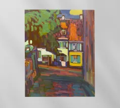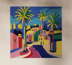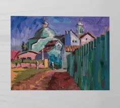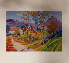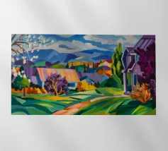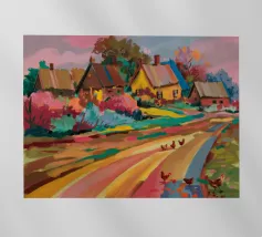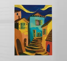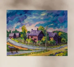 Un dipinto espressionista di una strada di paese, caratterizzata da case dai colori vivaci nei toni del verde, del blu e del bianco, con una suggestiva strada viola che conduce lo sguardo, il tutto sotto un cielo luminoso ed energico.