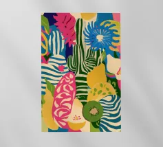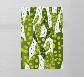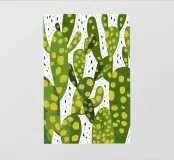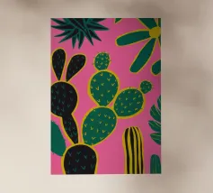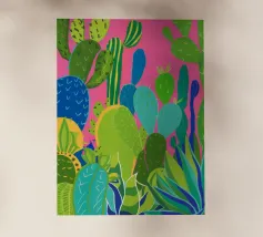 Un disegno stilizzato e ravvicinato di un cactus fico d'India mostra i suoi cuscinetti verdi e le sue macchie gialle in un disegno grafico e vibrante, che cattura la consistenza unica della pianta del deserto.