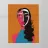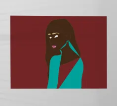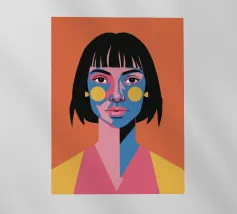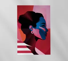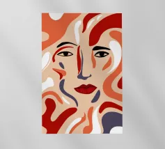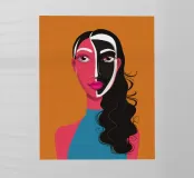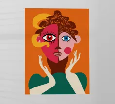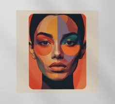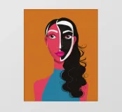 Un suggestivo ritratto astratto di un volto di donna, diviso in due metà, una nera e una bianca, con labbra rosse e capelli fluenti su un caldo sfondo arancione.