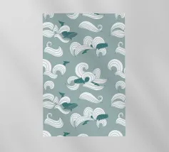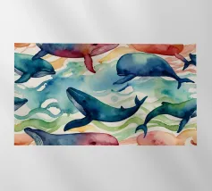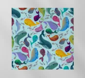 Tante balene colorate disegnate a mano e immerse nell'acqua con pesciolini e bolle.