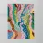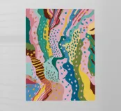 An abstract composition of flowing, wavy lines and organic shapes in a vibrant palette of green, pink, blue, and orange, creating a sense of joyful movement and rhythm.