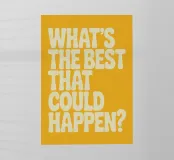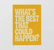 Design tipografico giocoso con la scritta "WHAT'S THE BEST THAT COULD HAPPEN?" in grandi lettere sans-serif arrotondate color crema su sfondo arancione. Le lettere chiare e spesse creano una dichiarazione moderna e accattivante.