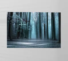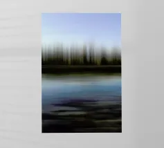 Delicato paesaggio invernale astratto con alberi spogli che si confondono in fresche tonalità di blu e bianco. La leggera sfocatura dovuta al movimento conferisce al soggetto un'atmosfera tranquilla, quasi onirica, e sottolinea la silenziosa bellezza dell'inverno.