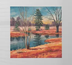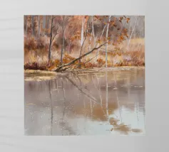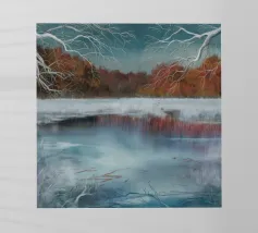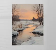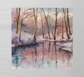 Bare trees and pink skies reflect softly in a thawing winter pond, evoking serene cold beauty.