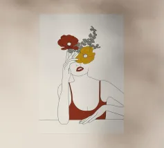 Un disegno al tratto minimalista raffigura il profilo di una donna dall'espressione serena. I suoi capelli sono ornati da grandi fiori stilizzati di colore arancione e giallo e da foglie delicate.