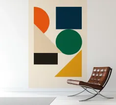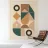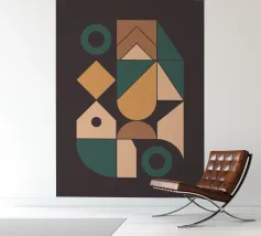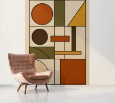 Un'opera d'arte astratta di forme geometriche nei toni del verde terra, dell'arancio e del beige, disposte con equilibrio su uno sfondo chiaro e strutturato.