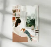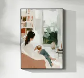 Questo sereno poster digitale cattura un tranquillo momento di contemplazione davanti a una grande finestra. Una donna, resa in uno stile semplice ed elegante, siede comodamente su un divano, tenendo in mano una tazza di caffè caldo e osservando un paesaggio verde e astratto. L'opera è caratterizzata da una sofisticata tavolozza di colori neutri e terrosi - bianchi cremosi, terracotta morbida, marrone e verde salvia - accentuata da una libreria stilizzata. Le pennellate visibili e spesse di impasto conferiscono una qualità ricca e materica all'intera scena. Questo download digitale di alta qualità (7000x5000 pixel, 300 dpi) è perfetto per aggiungere una