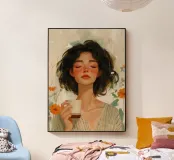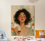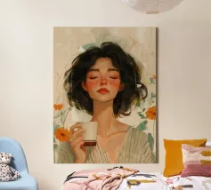 Quest'opera d'arte cattura un tranquillo momento mattutino caratterizzato da quiete e calore. Una donna con gli occhi chiusi tiene in mano una semplice tazza, completamente immersa in una pausa tra il sonno e la veglia. Texture morbide, toni tenui e delicati elementi floreali creano un senso di equilibrio e calma. La composizione enfatizza l'introspezione e la presenza, invitando lo spettatore a rallentare e ad apprezzare la bellezza di un inizio senza fretta. Ideale per interni moderni che valorizzano la morbidezza, la consapevolezza e l'eleganza sobria.
