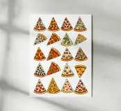 Questo stravagante e colorato motivo alimentare presenta una deliziosa varietà di fette di pizza a fumetti su uno sfondo bianco pulito. Con diversi condimenti come salame piccante, olive, funghi, pomodori e basilico, questa illustrazione è perfetta per l'arte murale della cucina, per il design del menu di una pizzeria o come elemento di un divertente motivo senza cuciture. Ideale per lo scrapbooking digitale, la stampa su tessuto o la creazione di adesivi e decalcomanie giocose, questa grafica vettoriale di alta qualità trasmette un'atmosfera allegra e appetitosa. Cercate questa simpatica illustrazione di pizza per aggiungere un tocco vivace e ispirato alla gastronomia ai vostri progetti commerciali o personali.